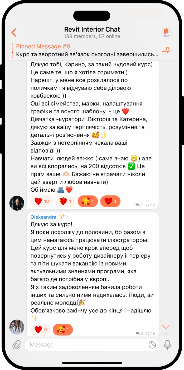 «Я в неймовірному захваті від курсу! Вважаю що це було найкращим рішенням навчитися роботі в Ревіті і обрати для цього саме курс Карини! Дуже зрозуміла подача інформації, все чітко, структуровано, постійна підтримка на курсі по всім питанням, навіть по дуже дріб’язковим. Що мені також ну дуууже сподобалось - це сама платформа і організація роботи на курсі.
